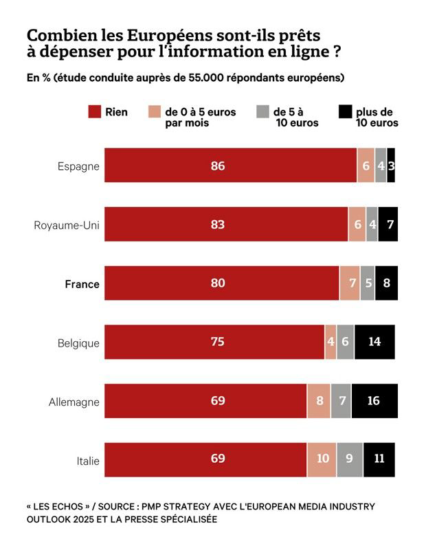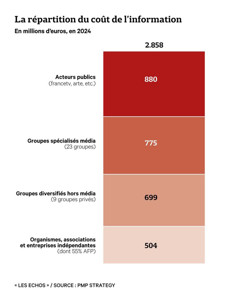 La production de l’info coûte 2,9 milliards d’euros par an en France (hors impression-distribution de journaux, France Médias Monde et INA), selon cette étude qui note aussi une hausse de 4 % sur 2022-2024, surtout à cause de l’inflation des prix de l’énergie et autres frais (reportages sur le terrain, etc.) tandis que (sans surprise) la majorité des dépenses est en masse salariale.